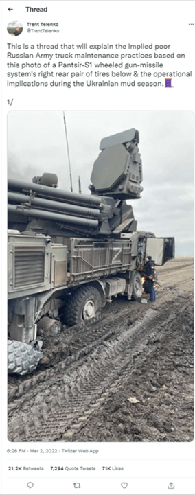 The measured areas of U.S. Army readiness (P,S,R,T) offer a common framework to evaluate readiness, and can provide additional insight with the understanding that these measured areas are often interrelated. Taking the example of the Russian Pantir S-1 Air Defense system mentioned in the Tweet above, whose wheels fell apart on Ukrainian roads, maintenance (R), should have indicated that this vehicle was not ready for combat. Additionally, analysis shows that this type of tire issue results from underuse. If these tires were underused, you can assume that the troops were probably not well-trained on the system (T). There are multiple areas that would have indicated that this vehicle, and presumably its crew, were not ready for combat.