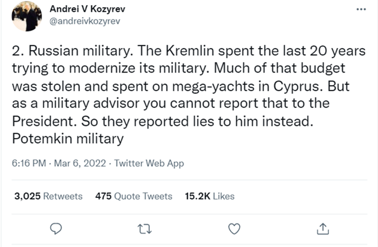 3. You are only as strong as your weakest measured area. Pictures of the broken-down Russian equipment have flooded social media, showing serious problems in Russian maintenance and training. From pictures of Russian tanks being towed away by Ukrainian tractors, to videos of tires melting apart on highways, there are many facets to the breakdown in Russian Army readiness.
